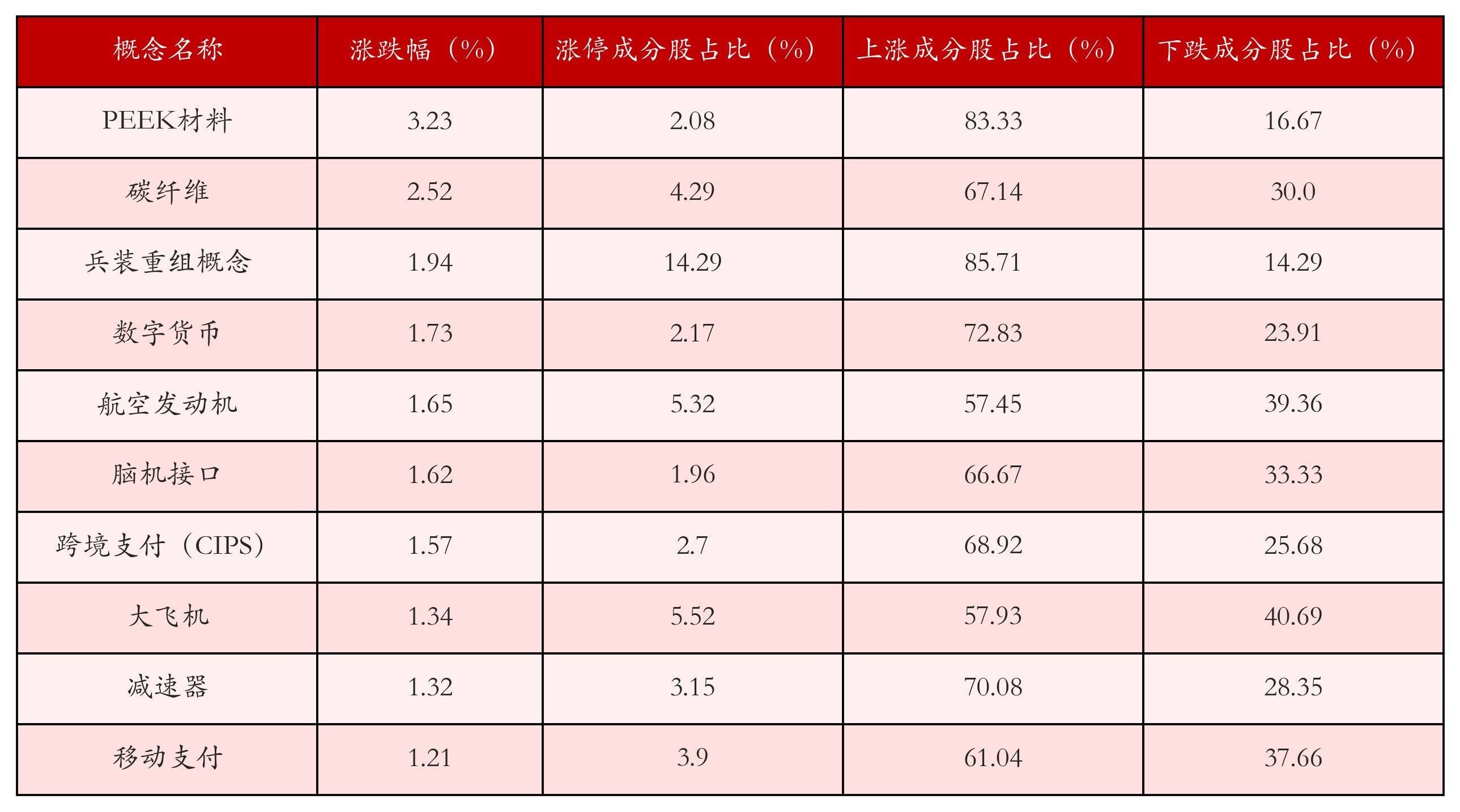 根据A股概念涨跌幅与所对应的股票池综合分析,涨幅靠前的三个概念板块分别为:PEEK材料、碳纤维与兵装重组概念。排名前10位的概念板块相关数据见下表: